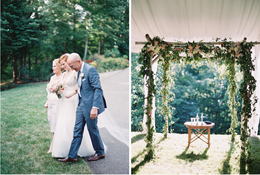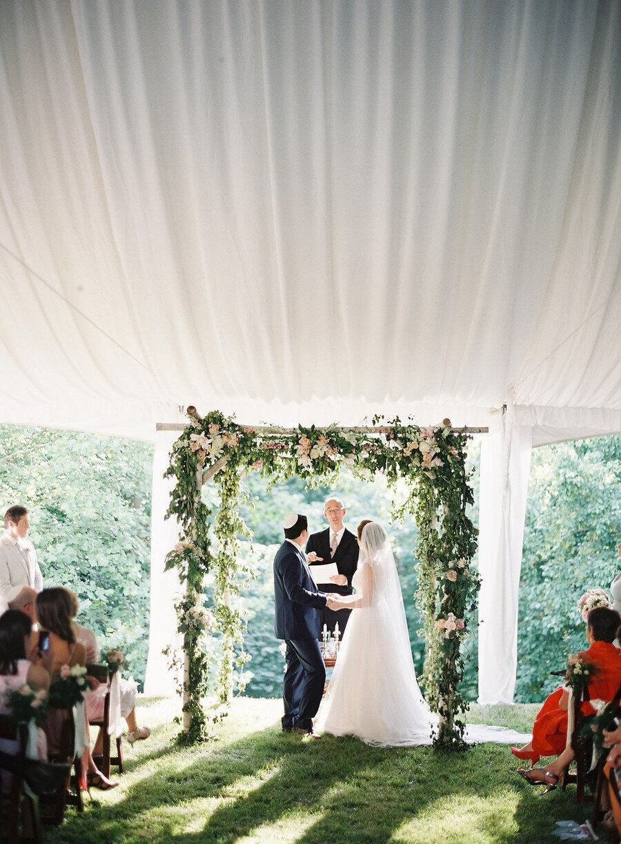 They were married under a soft white tent and a birch wood chuppah covered spectacularly in fresh greens and blooms. Though we added a tent at the last possible minute (there was rain in the forecast!), we worked hard to preserve the look and feel of the outdoors. It was so magical to see the depth and beauty of the tree line behind the ceremony, interrupted only by the perfectly warm glow of sunshine streaming in. This location on the family's property was so meaningful because it sits directly in the view of the father of the bride's office window. For years he dreamed of seeing his daughter marry in that spot and we were so thrilled to see his idea come to life!
