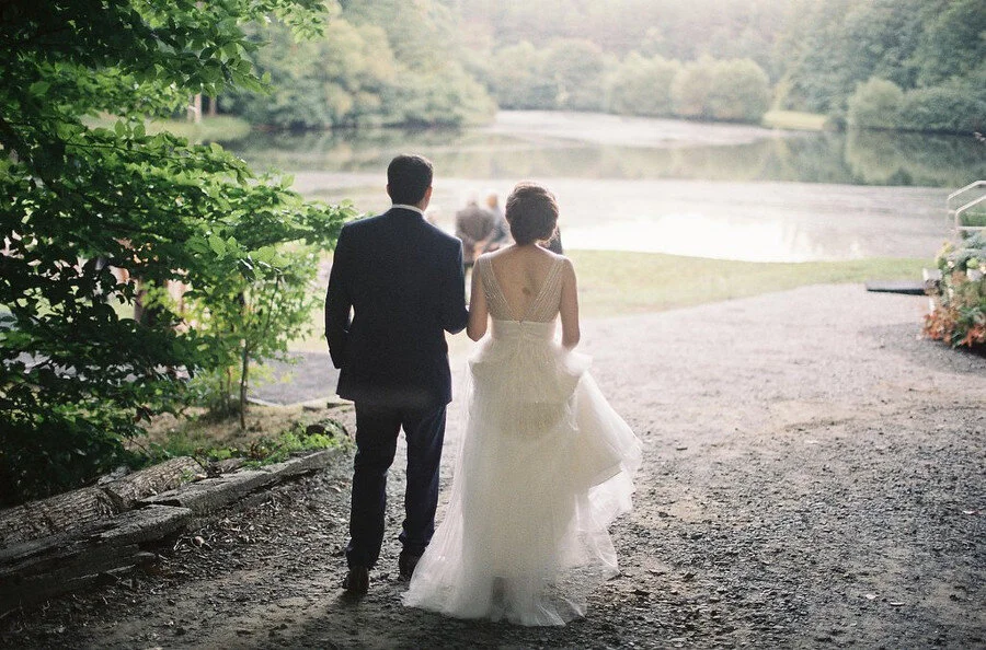 After the ceremony, guests proceeded down a long path through the woods to a clear top tent for cocktail hour overlooking a private lake. They enjoyed cocktails and hors d'oeuvres while the jazz trio played, before being ushered into the grand tent for the reception. As guests dined on the amuse bouche (fresh summer peach soup with blueberries - yum!) Sam and Becca surprised everyone with a choreographed first dance they had practiced for months. These two self-described "non-dancers" brought most of the room to happy tears. It was perfect! Following a beautiful four-course dinner, dances between the father and his daughter, and mother with her son, and a slew of heartfelt toasts, the band kicked things into high gear with a lengthy and lively time-honored Jewish wedding tradition: the hora! Hours of dancing followed until midnight and the night ended at 3:00 am with a pool-party and DJ.