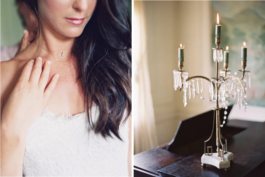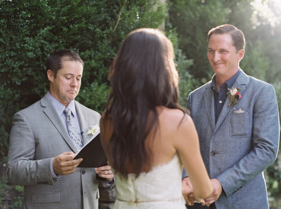 The "altar" space behind Sara and Justin as they said their vows was a rock wall with a cut-out bench that was covered in green ivy and other vines. It was beautiful but it felt so heavy to me. Sara's mother had given me a bucket full of white flowers she foraged from her own yard, so I separated the petals and sprinkled the blooms all over the ivy. It reminded me of lace and helped create a softer backdrop for the ceremony. I added some assorted glass vessels with white candles and love how it all turned out!